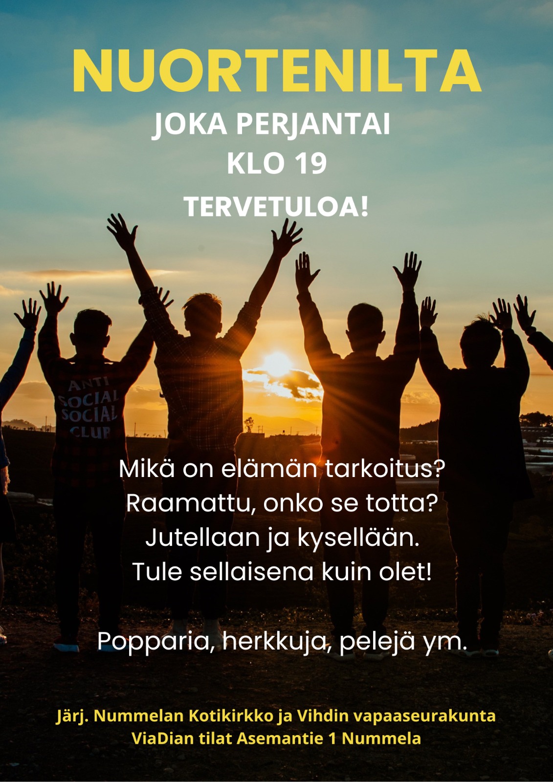 Nummelan Kotikirkko on avoin kaikille. Me olemme joukko eri-ikäisiä ja tavallisia ihmisiä elämän eri sektoreilta, joita yhdistää usko Jeesukseen. Seurakunnan tilaisuuksiin voi osallistua vapaasti, vaikka ei olisi seurakunnan jäsen. Koko seurakuntaväelle suunnattuja tilaisuuksia järjestämme pari kertaa viikossa. Nummelan Kotikirkon tilaisuuksista ja niihin liittyvistä mahdollisista poikkeuksista tiedotetaan näillä seurakunnan kotisivuilla, facebookissa ja Vihdin Uutiset -lehdessä. TERVETULOA MUKAAN!