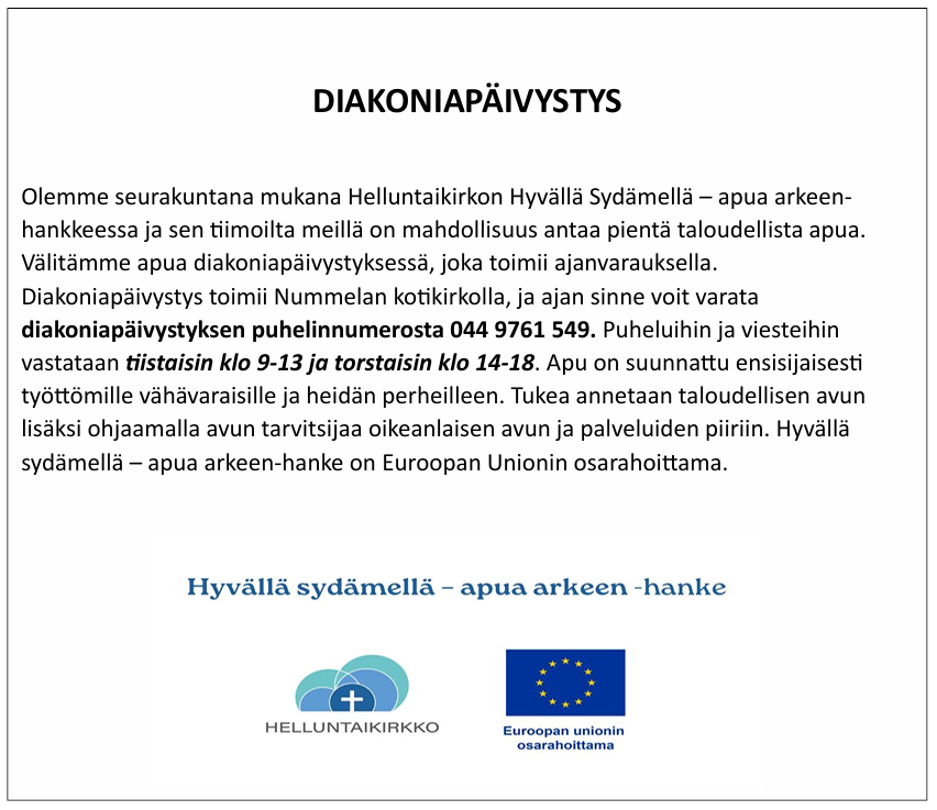 Nummelan Kotikirkko ei ole olemassa vain jäseniään varten, vaan hyvä sanoma Jeesuksesta kuuluu kaikille vihtiläisille ja aina maan ääriin saakka. Hengellisen hyvinvoinnin ohella haluamme kaikilla muillakin mahdollisilla tavoilla vaikuttaa ympäröivän yhteiskunnan hyväksi.